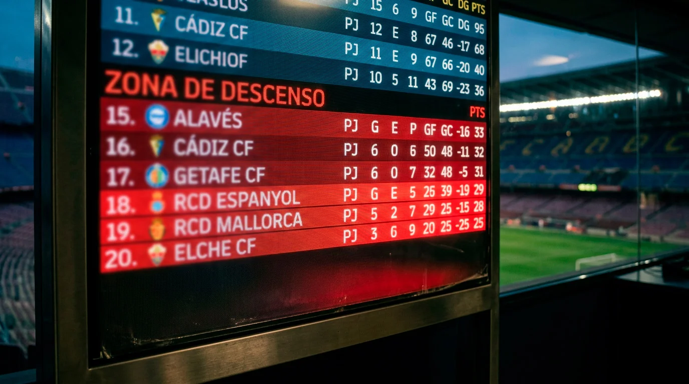 Los indicadores que uso para pronosticar el descenso son: xG defensivo acumulado en la primera vuelta – los equipos que conceden muchas ocasiones claras acaban pagándolo -, rendimiento como visitante – los equipos que no puntuan fuera de casa tienen un problema estructural que rara vez se corrige en la segunda vuelta -, y profundidad de plantilla – un equipo con once titulares decentes pero sin banquillo sufre desproporcionadamente las lesiones y las sanciones.